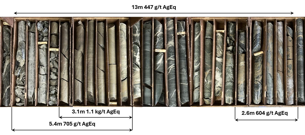 - 604 g/t AgEq over 2.6 metres