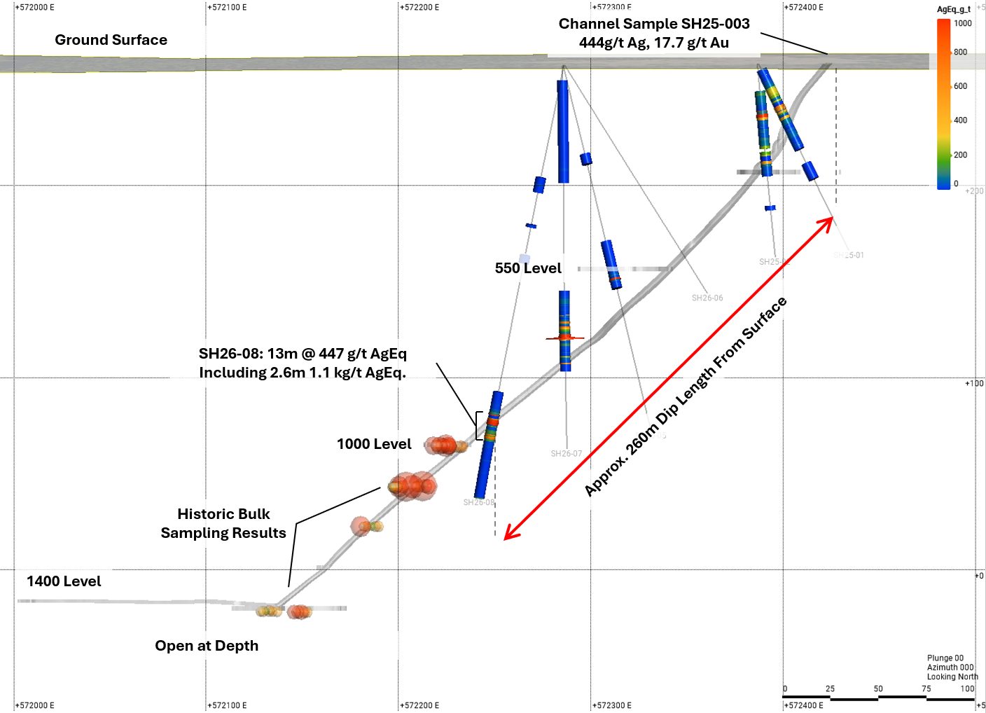 Drill hole SH26-08 intersected 447 g/t silver equivalent (AgEq) over 13 metres, highlighting the scale and strength of mineralization. Within this broad interval, the company identified multiple zones of exceptional grade, including: