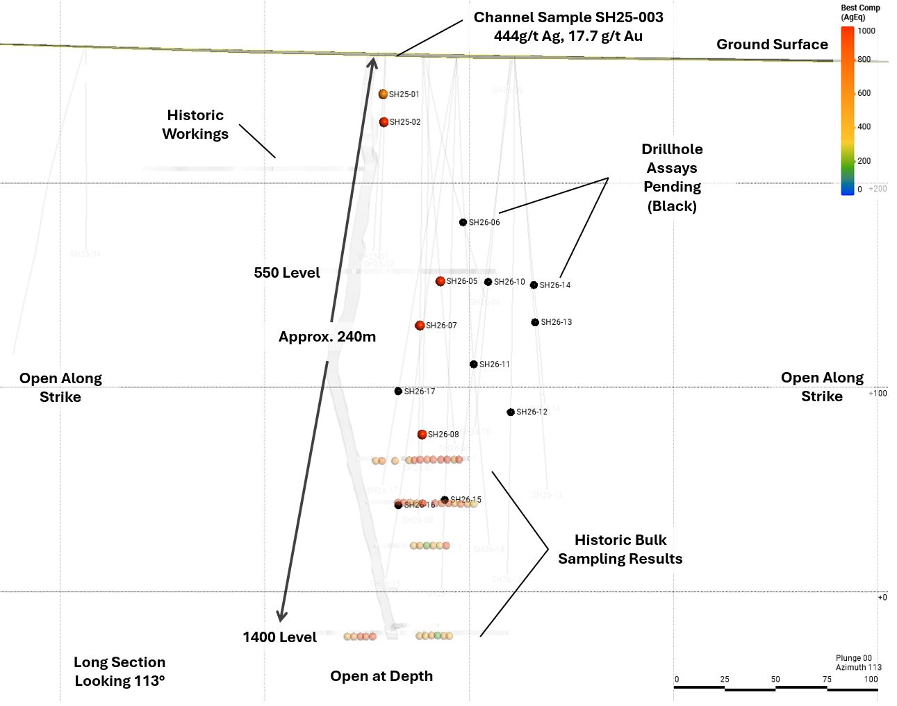 Figure 6: Long section looking east-northeast (113°) showing intercept locations colored by AgEq grade. Note black intersections indicate assays pending with approximate locations.