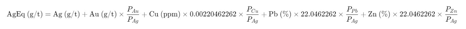 *Metal values used in AgEq calculations are from the 200-day moving average values from 2/6/2026, and all values are in USD. PAu= $124.5/g, PAg= $1.58/g, PCu= $4.9/lbs, PPb=$0.90/lbs, PZn=$1.11/lbs, 0.00220462262 = grams-to-pounds conversion factor, 22.0462262 = pounds per tonne for 1% metal.