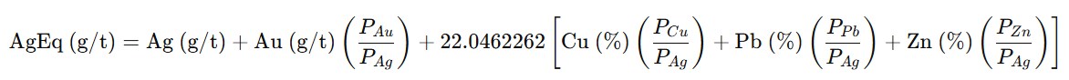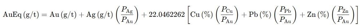 Metal values used in AuEq calculations are from the 200-day moving average values from 2/6/2026, and all values are in USD. PAu= $124.5/g, PAg= $1.58/g, PCu= $4.9/lbs, PPb=$0.90/lbs, PZn=$1.11/lbs, 0.00220462262 = grams-to-pounds conversion factor, 22.0462262 = pounds per metric tonne for 1% metal.