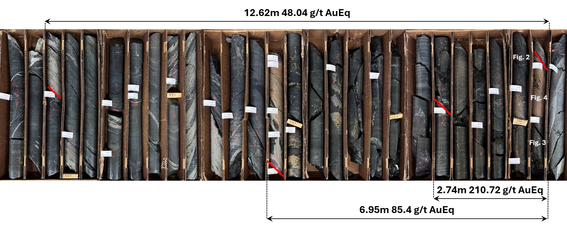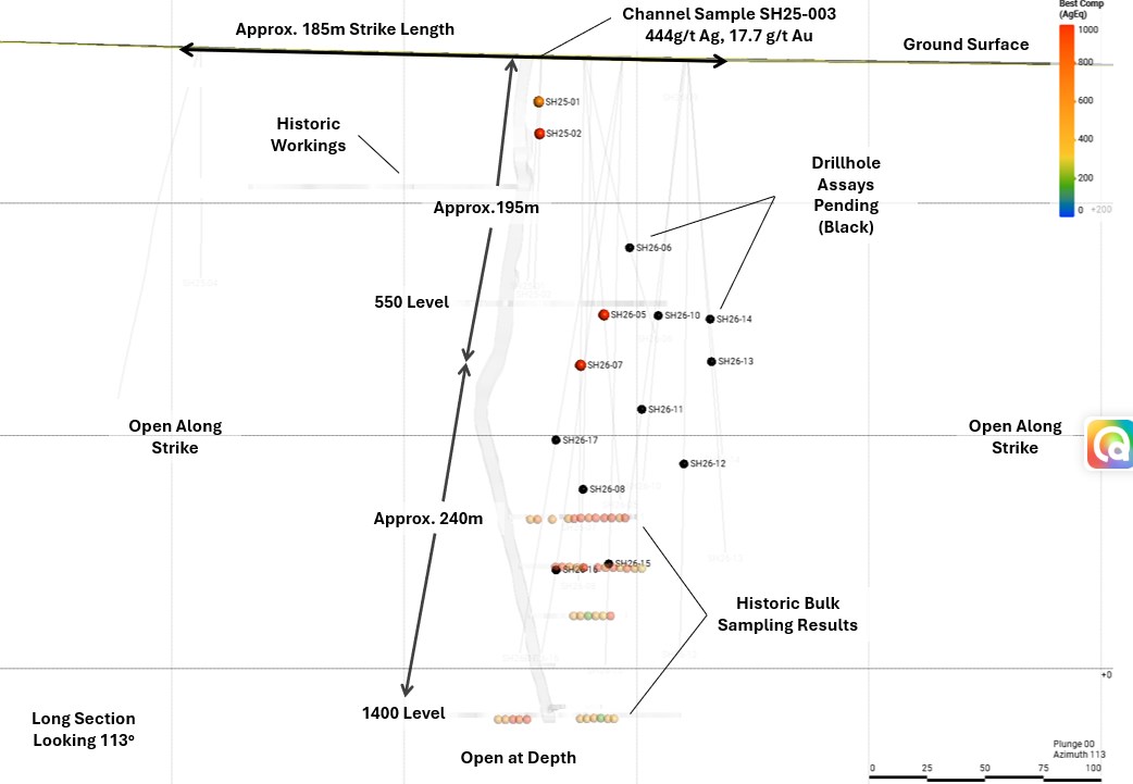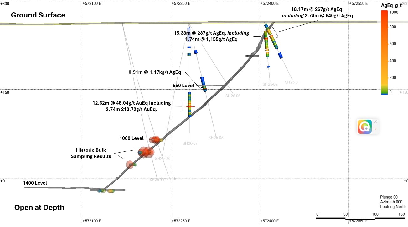 SH26-07 intercepted 12.62m of 48.04 g/t AuEq, including 6.95m of 85.4 g/t AuEq and 2.74m of 210.72 g/t AuEq. These assay results highlight the high-grade potential of the system, demonstrating significant upside in gold value. Additionally, they represent a dip length extension of 195 meters below surface. Ongoing exploration results show visual confirmation of massive to semi massive sulfide mineralization both down dip and along strike.